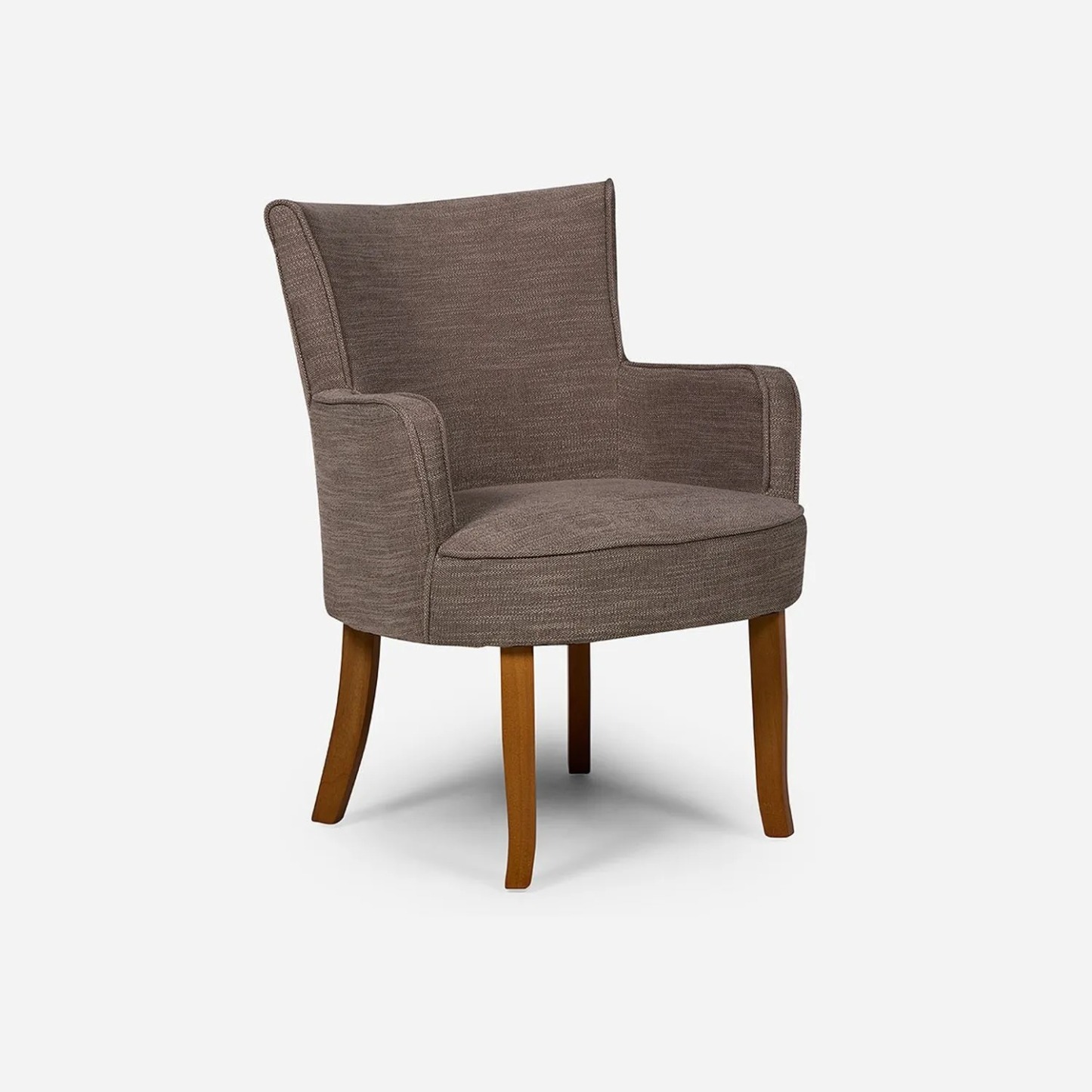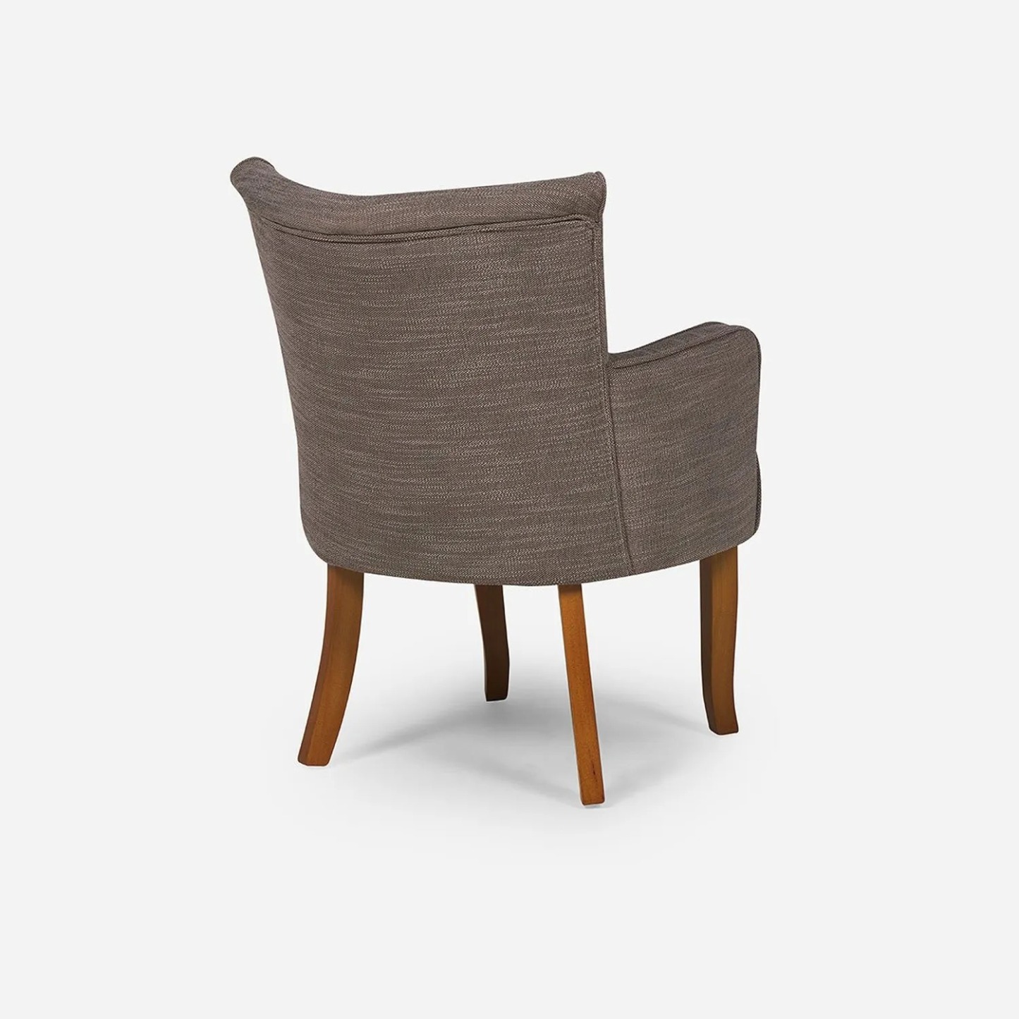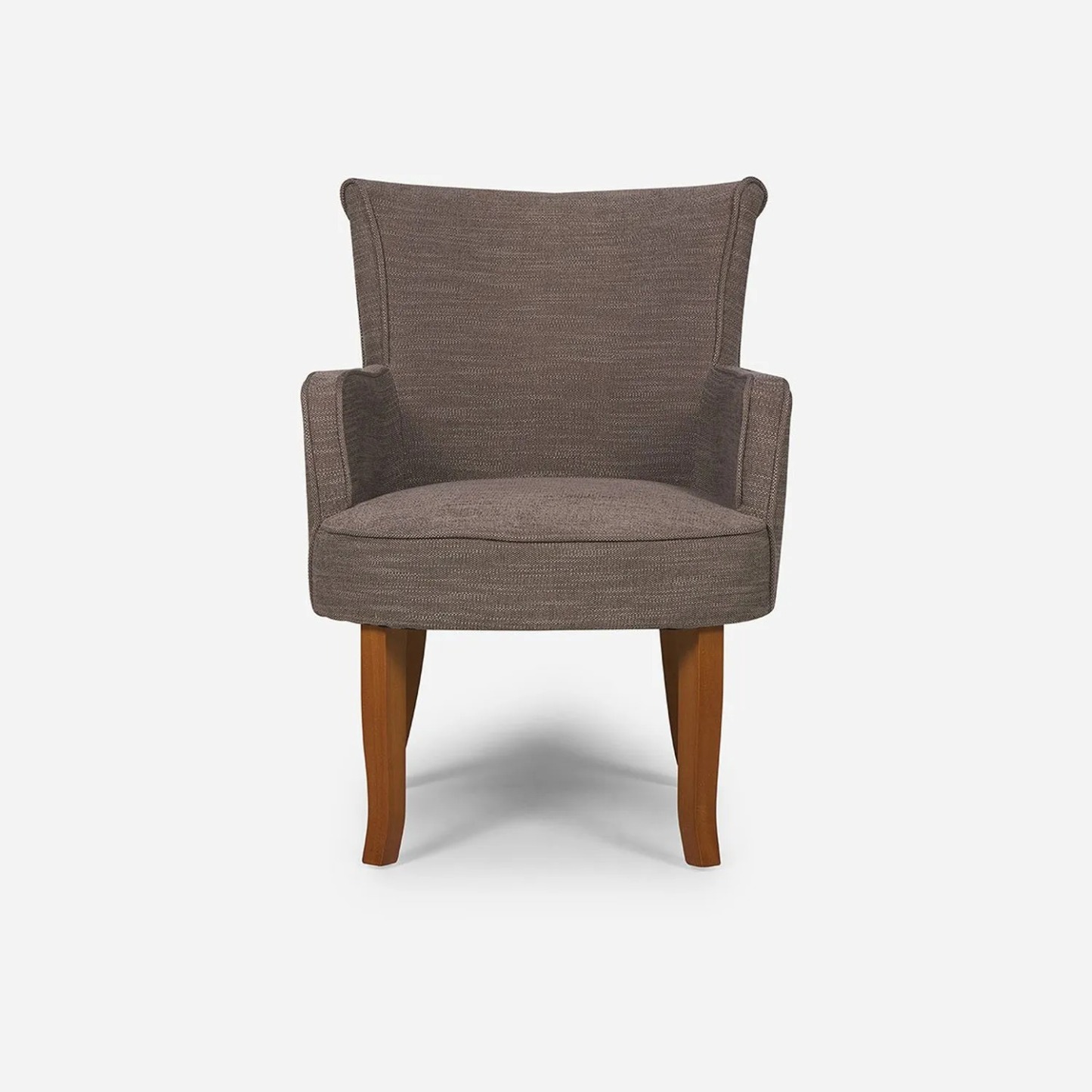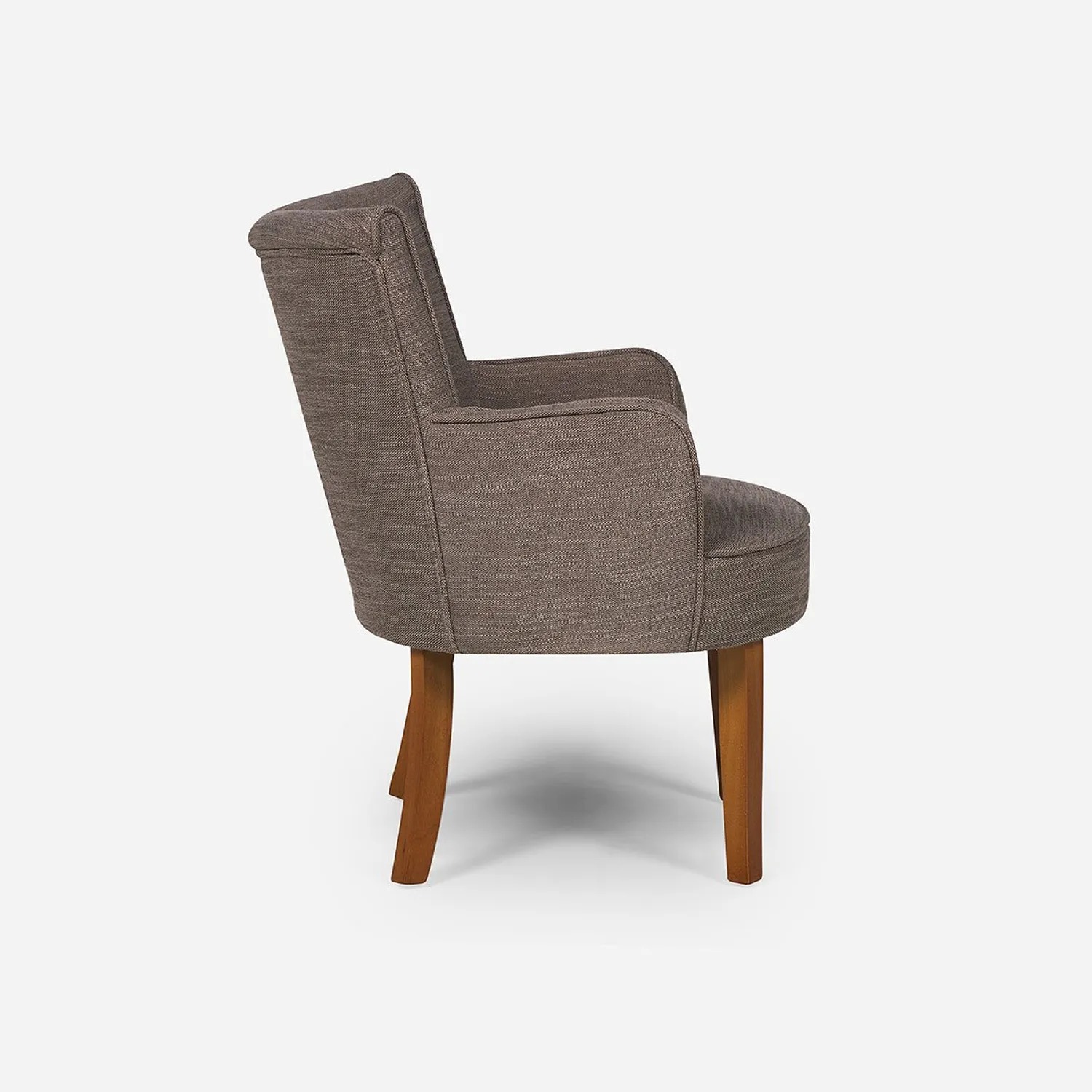 Poltrona con un diseño clásico con sutil estampado al contraste. Patas de madera de caucho muy resistentes y tapiz de tela 100% poliéster.
